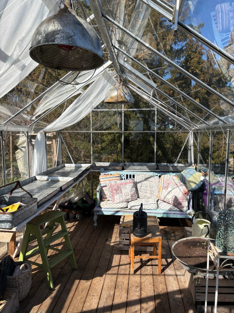 En grönfink har hittat ut den blåsiga udden, vilket hon och jag pratar om.