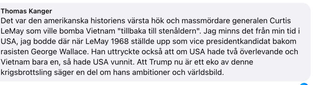 Varför intressant? Därför att Trump gick till val på att sätta stopp för USA:s ”eviga krig” och USA:s självpåtagna rätt att agera världspolis. När han nu säger att han är beredd att bomba Iran ”tillbaka till stenåldern” är det ett eko av vad andra presidenter före honom sa redan under Korea-, Vietnamkriget och kriget i Afghanistan.