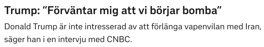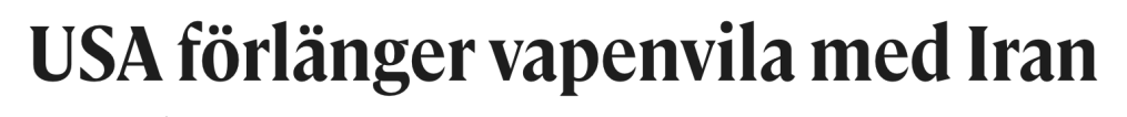 Detta efter att under de senaste 24 timmarna hotat återuppta bombningarna, redan vunnit kriget, både öppnat och blockerat Hormuzsundet och ljugit för sina väljare att ”vi är nära ett avtal med iranierna” och att han inte är intresserad av att förlänga vapenvila.