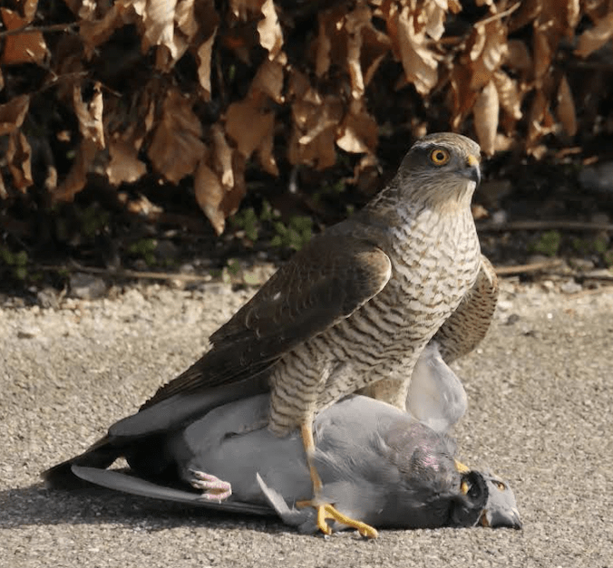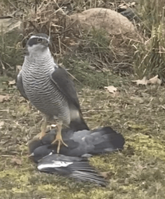 Han: Förutom att min kompis Thomas Kanger varit här i veckan fick vi uppleva ett fint besök i går. En duvhök hade slagit en duva och mellanlandet på det som är kvar på tomten på sjösidan.