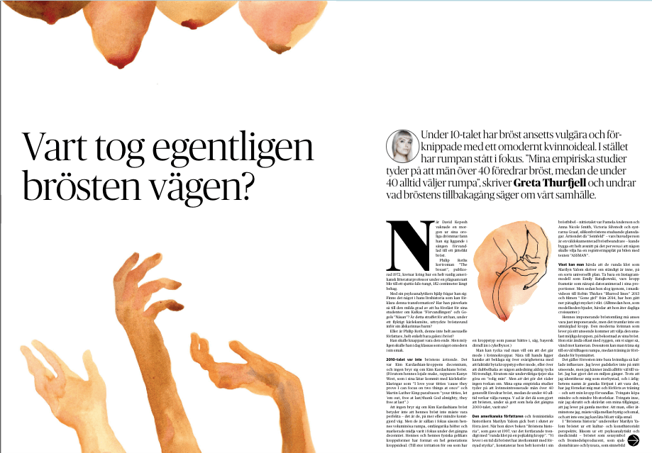 ”Mina egna empiriska studier tyder på att män över 40 generellt föredrar bröst, medan de under 40 alltid väljer rumpa”, skriver DN Kulturs Greta Thurfjell (själv storbystad, enligt artikeln) och undrar vad bröstens tillbakagång säger om vårt samhälle.