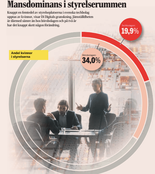 7. De nya unga techbolagen är Sveriges framtidshopp. Men när det gäller jämställdheten inger de inte hopp. Knappt en femtedel av styrelseplatserna i svenska techbolag upptas av kvinnor, visar Di Digitals granskning. Jämställdheten är därmed till och med sämre än hos börsbolagen och på två år har det knappt skett någon förändring.