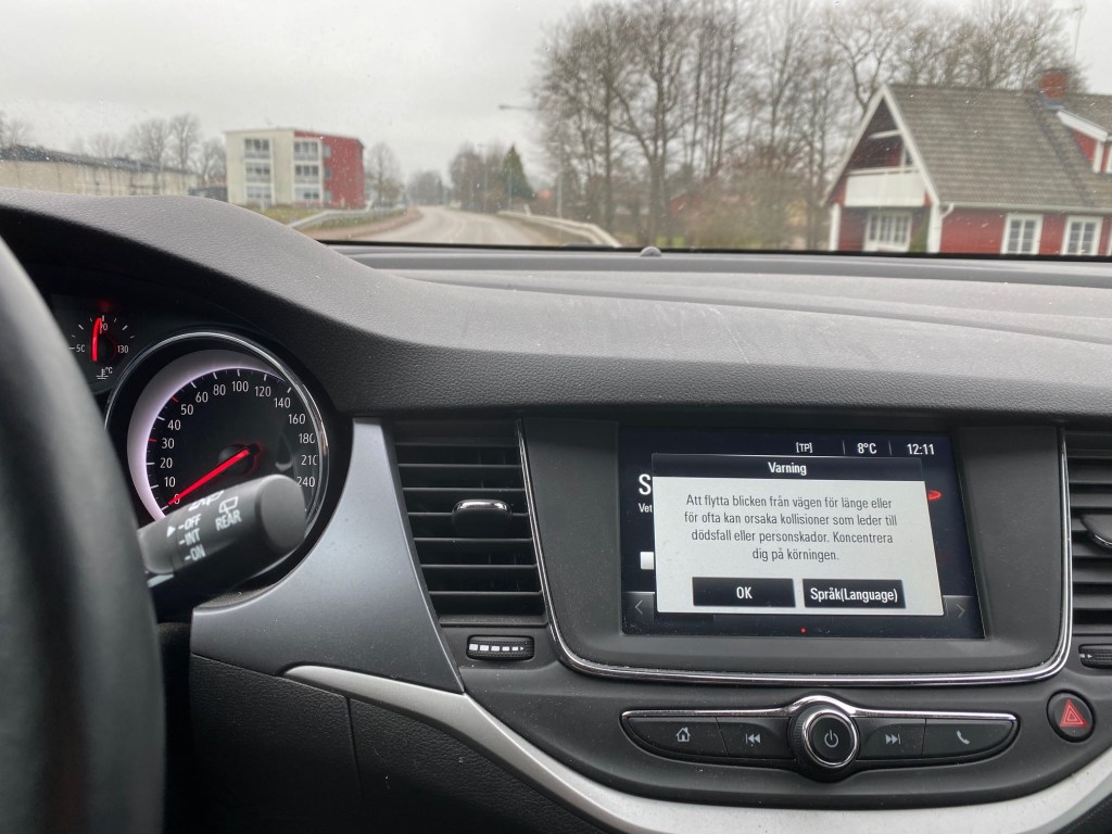 Det blixtrar till och i utkanten av mitt synfält kräver någon att jag tar del av budskapet: Att flytta blicken från vägen för länge eller för ofta kan orsaka kollisioner som leder till dödsfall eller personskador. Koncentrera dig på körningen.