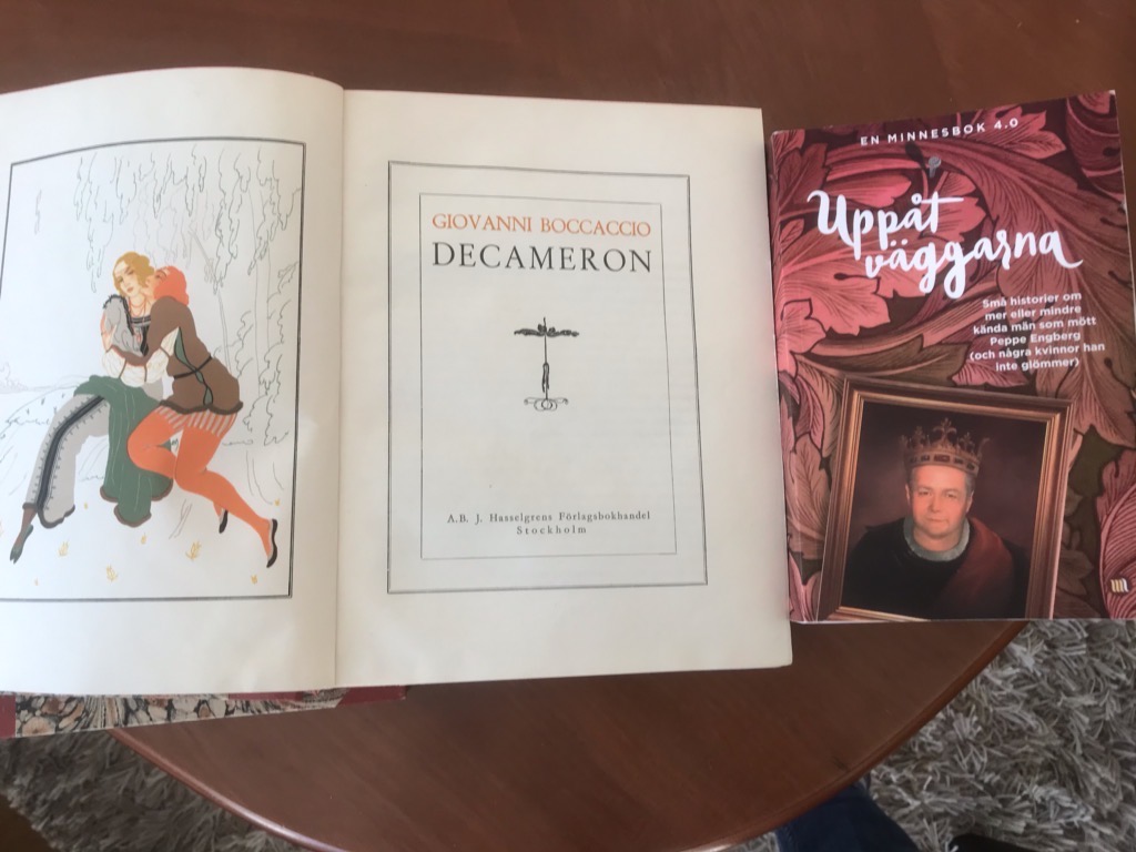 Även han tillhör vår ironiska generationen. Vid sidan av Giovanni Boccaccios ”Decameron” från år 1353 föreslår han omläsning av Peppe Engbergs ”Uppåt väggarna”, 4:e upplagan, 2020. Decameron handlar livet under digerdöden, i det andra verket finns knappast en enda dyster tanke om jag minns rätt.