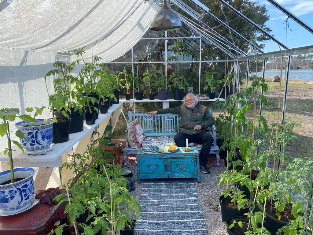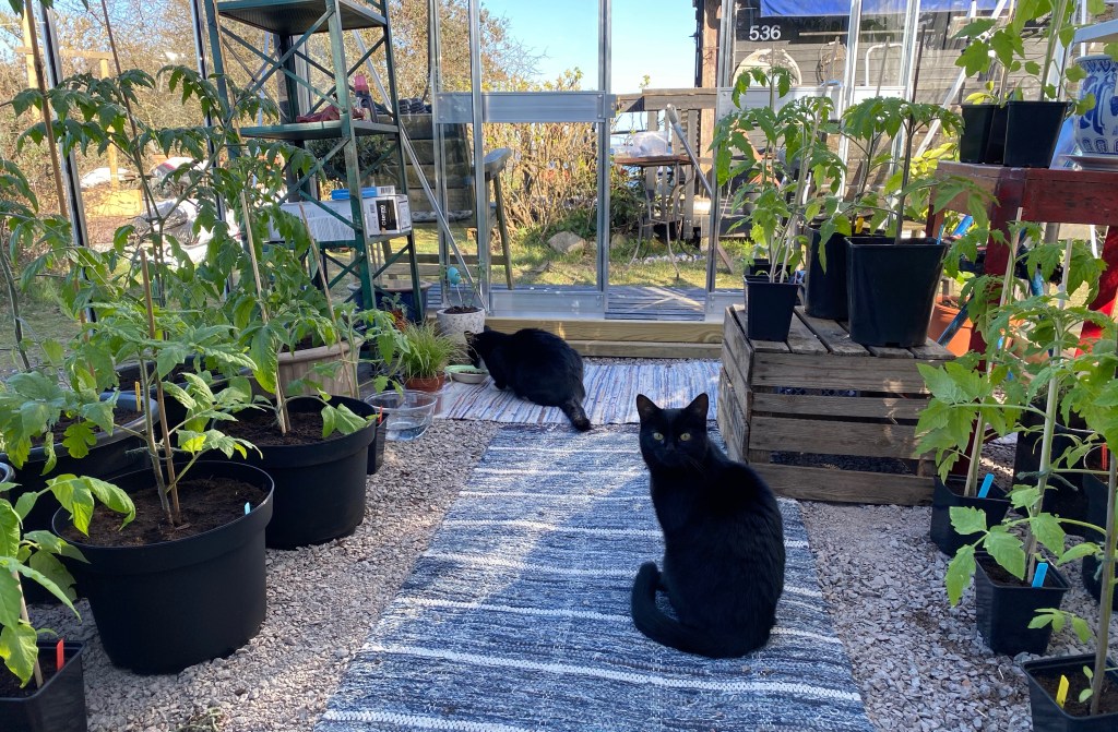 Hon: och matte är väldigt nöjd med nya hyllorna! Så nu har även en del av småplantorna fått flytta in, och jag kommer få plats med fler. Men efter drygt tre timmar på Ikea och ett kök samt några sängar senare får det bli imorgon. Peppe såg mest fram emot Ikeas korv, men både korvserveringen och restaurangavdelningen var stängda, ingen lunch med andra ord. Men med lite chips och jordnötter till kvällsdrinken i växthuset så ser han ganska glad ut ändå. Trots hemsk ryggvärk…