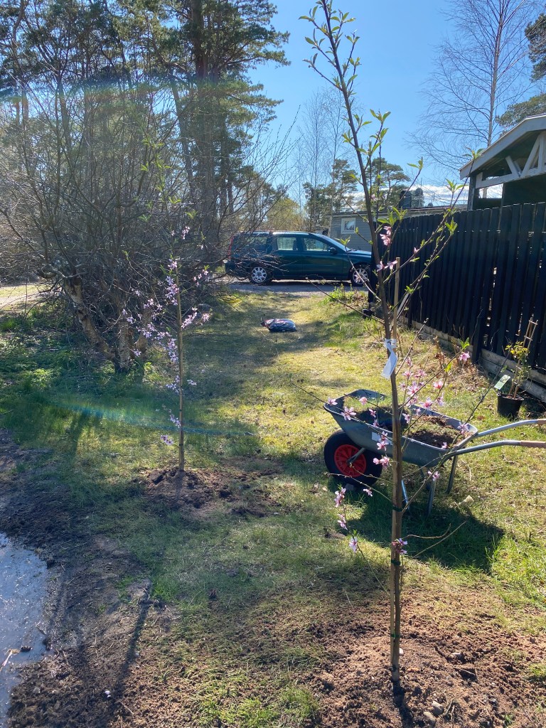 Hon: angående gårdagens små glädjeämnen, vi köpte och planterade fyra träd, två äppel och två sötmandelträd. Två av vardera för båda behövde en kompis för att pollineras. Annars hade vi nog köpt ett persikoträd också, men det kanske blir ett sånt också. Så småningom.