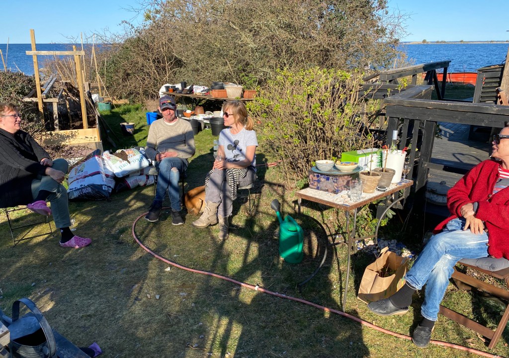 Bästa grannarna kom, och vi invigde träden med några flaskor rosé. Hasse, Kicki, Ancy och Håkan. Och Eddie, boxer, var förstås också med. Många skratt när Kicki berättade vad man förväntas hållas koll på som medlem i styrelsen härnere…