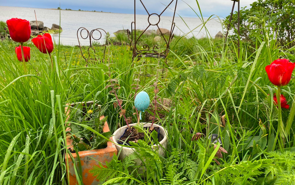 Och apropå att allt hänger ihop: I går skrev jag om näktergalen och rödstjärten. Egentligen hade jag bara tänkt publicera en bild på våra tulpaner som poppat upp på sjösidan.