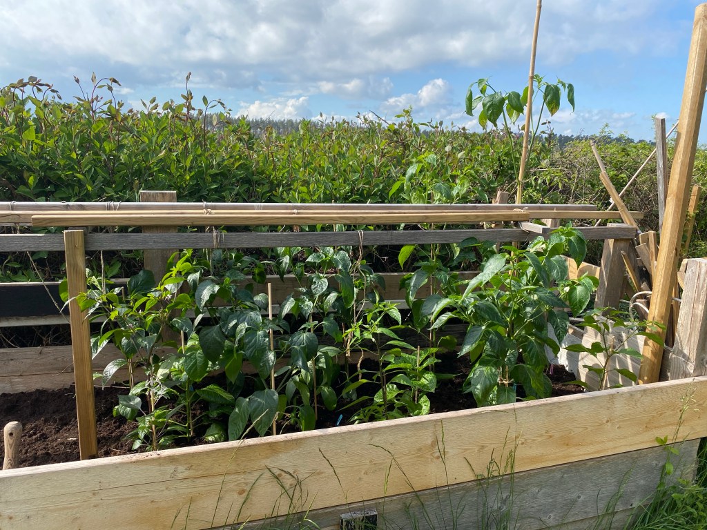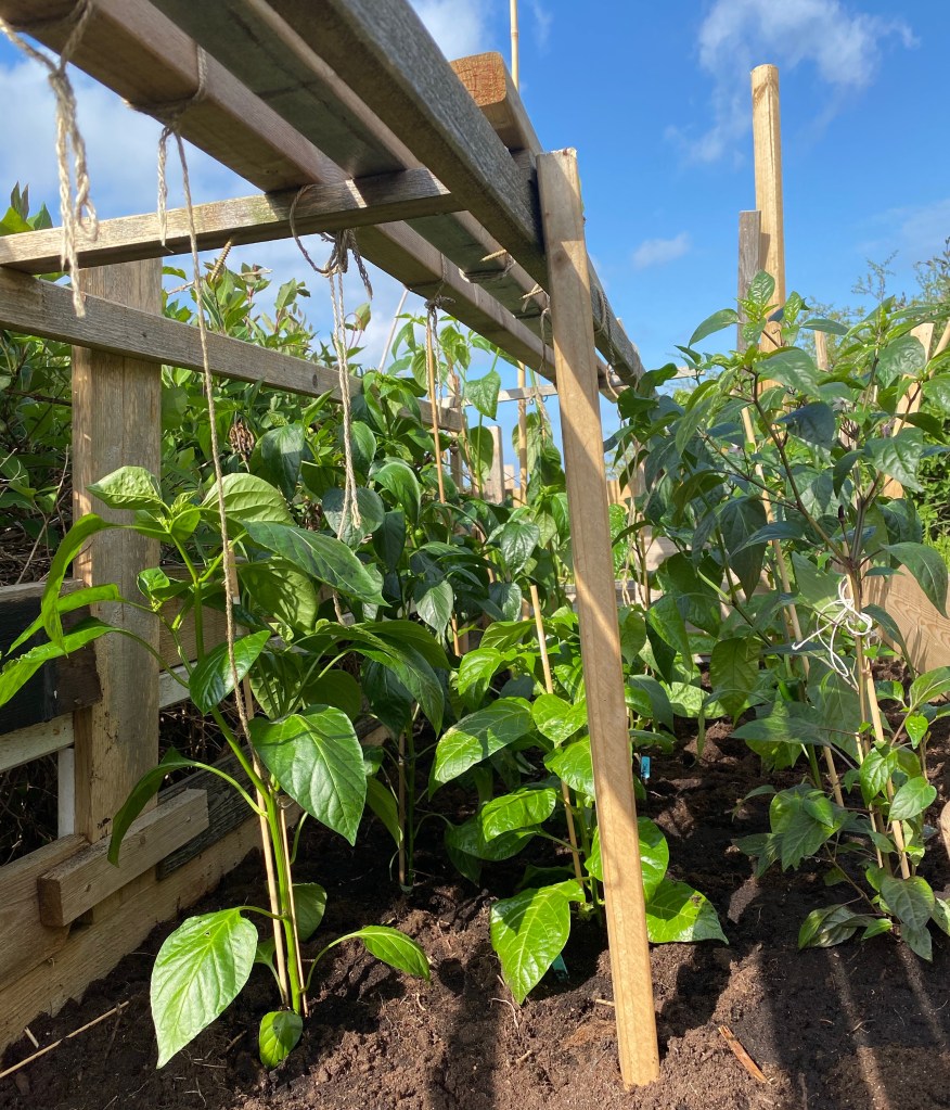 Tröttnade på att vänta och satte ut en hel del chili på friland, utan avhärdning. Har redan straffat sig, massor av vita blad från solskador. Har ju fler som tur är… har fortsatt sätta ut tomater, kommer mer bilder en annan dag. Trött, varit och storhandlat i Jämjö också. Hade gjort slut på typ allt. Jämjö ligger 2,5 mil söderut så det tar ett tag. Minimerar handlingstillfällena både därför och pga Corona. Gillar att koka soppa på en spik, så vi klarar oss länge.