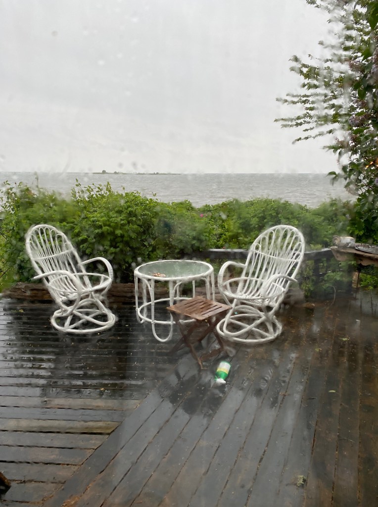 Han: Vi vaknar av blåsten. Tolv grader. Pålandsvind från ost, 13 sekundmeter i byarna. Inte läge att bygga altan. Klockan 11:10 ligger vi fortfarande i sängen. Känns som om jag vill ligga kvar här till det är dags att sätta på tv:n.
