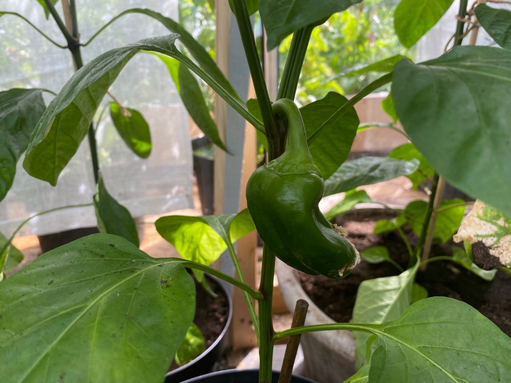 Paprikorna har också börjat växa till sig. I alla fall den vanliga röda som jag köpte i Paris. Alltså, inte röd än, men kommer bli. De avlånga spetspaprikorna och de bruna har inte riktigt börjat sätta fart än. Hoppas de gör det snart…