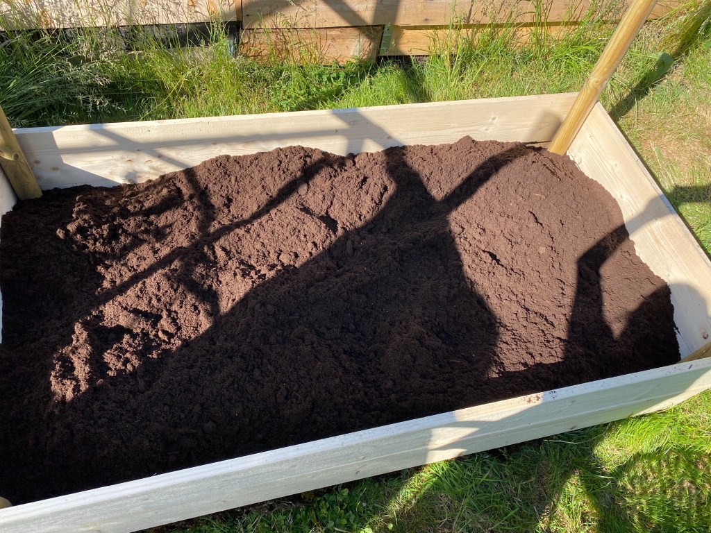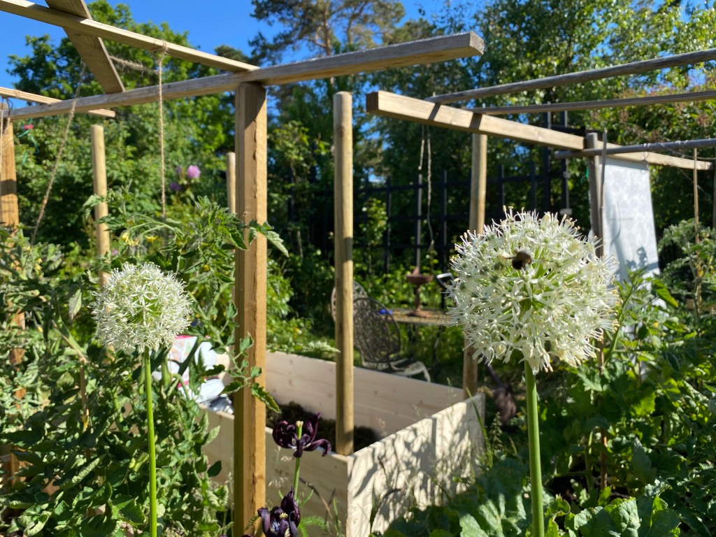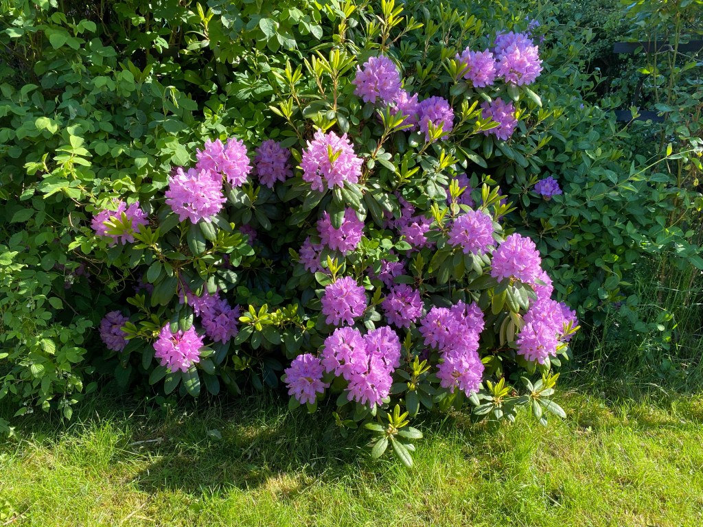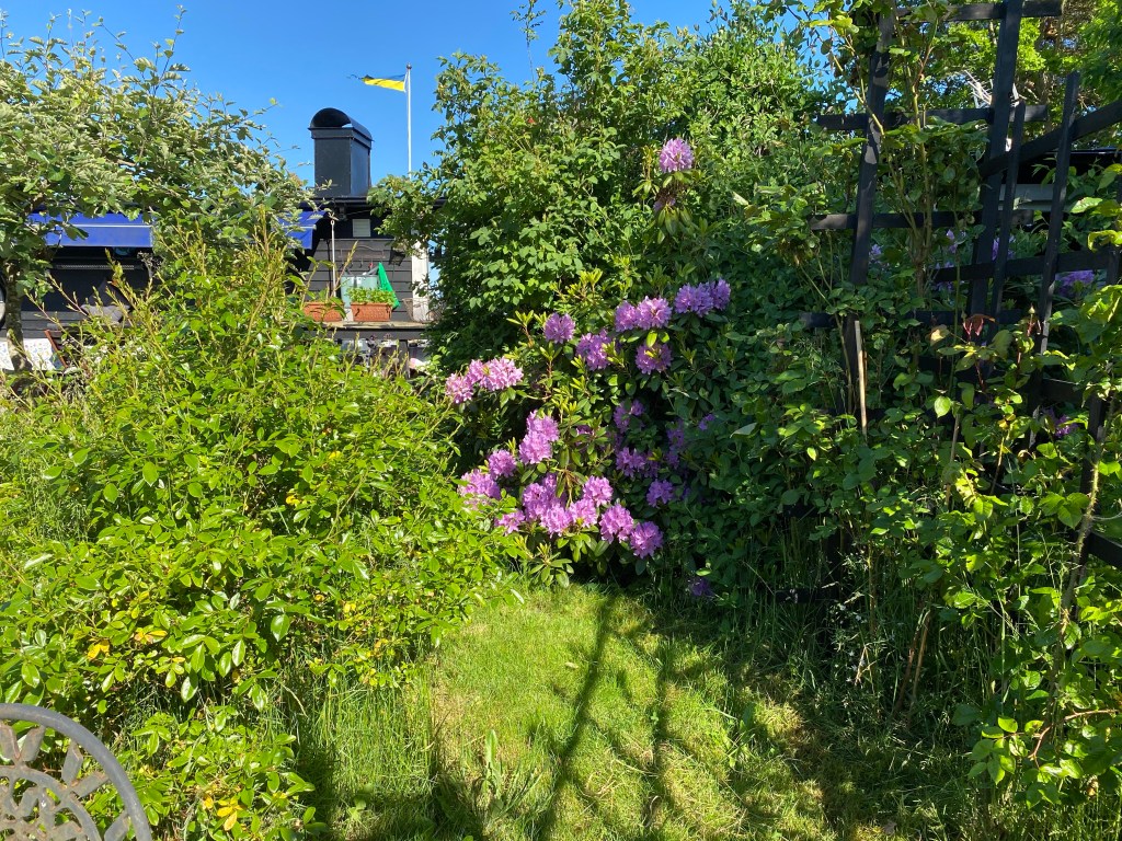 Hon: tack Peppe, älskar min nya odlingsbädd. Svårt välja ut vilka plantor som ska få bo där bara. Men först, eller rättare sagt efter två skottkärror med tång ska jord i. 6 säckar x 80 liter gick åt. Pust! Såg medan jag höll på hur fint det börjar bli runt bäddarna. Vår rododendron blommar för fullt och massor av knoppar på rosorna. Och massa med bin har kommit. De är redan ute efter mig…