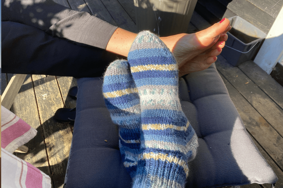 Hon hävdar att det är 20 grader i vattnet. Det tror jag inte på. Efteråt blev jag frusen. Intog eftermiddagsdrinken iklädd mina nya sockor som jag fått från en favoritfru i granngården.