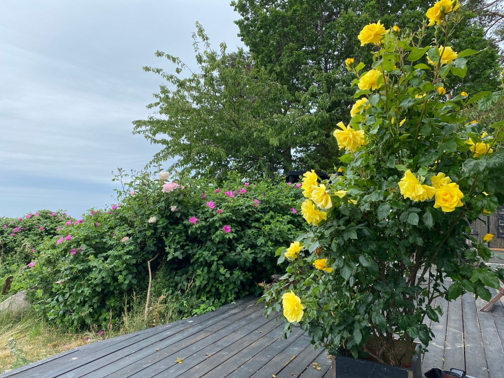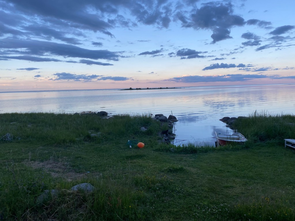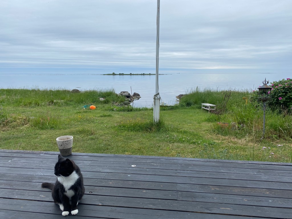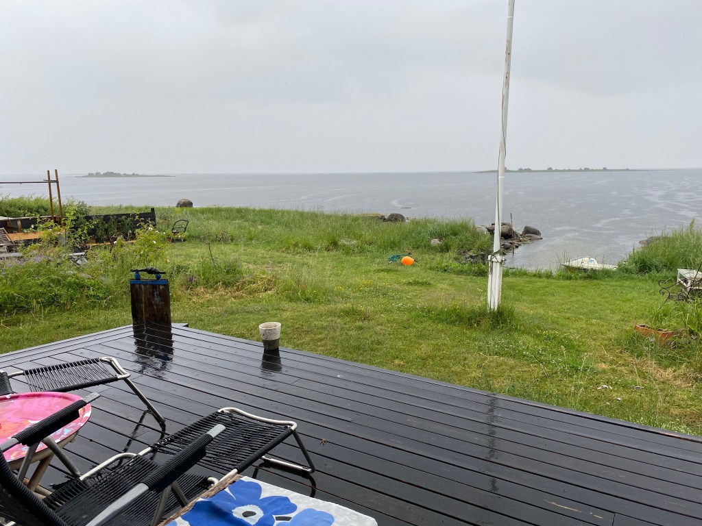 Hon: men det är fortfarande vindstilla, och som jag har längtat efter det. Ligger på soffan och läser Barran, ja vi fick gå in och fortsätta frukosten inne, men det gör inget. Skjutdörren är öppen och man hör regnet och faktiskt fåglar som kvittrar. Inte hört dem på veckor typ, vinden har överröstat dem eller kanske t.o.m skrämt iväg dem från udden in till viken i lä. Solen väntar jag på nu, ska tydligen spricka upp i eftermiddag. Hoppas, hoppas, hoppas!!!