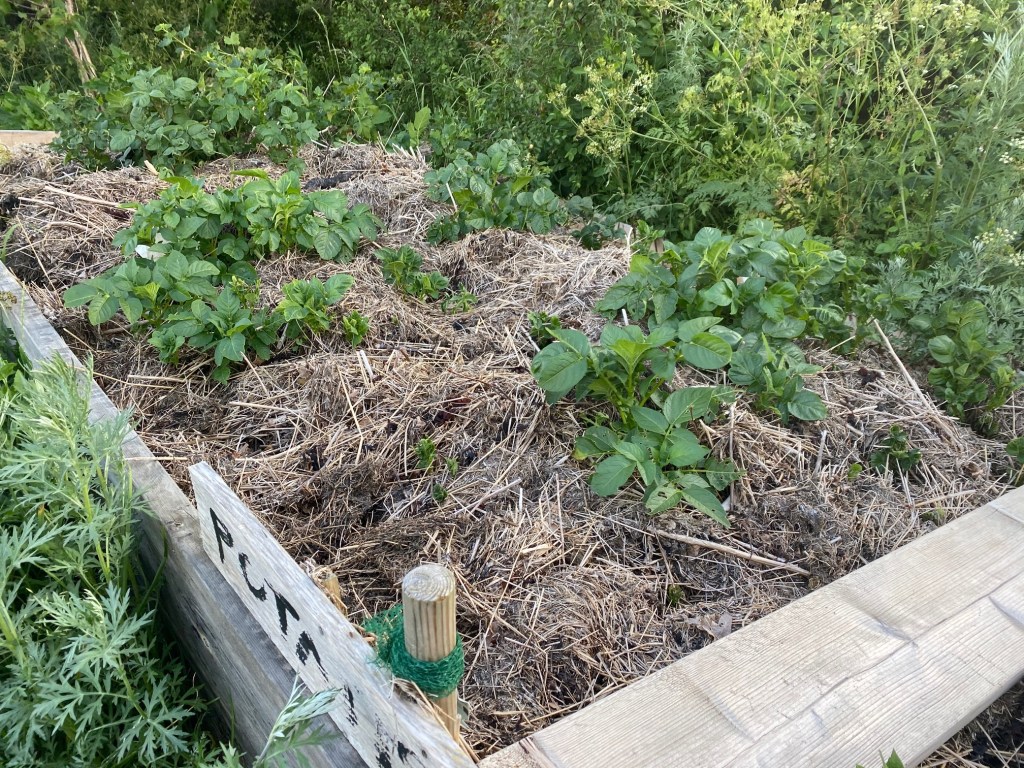 Dessutom behöver potatisen regn. Satte ut de sista knölarna i går. Av den dyra svarta franska päran syns inte ett spår. Men Monte Carlo och Casablanca växer på bra i tången. Som nu får den fukt den behöver.