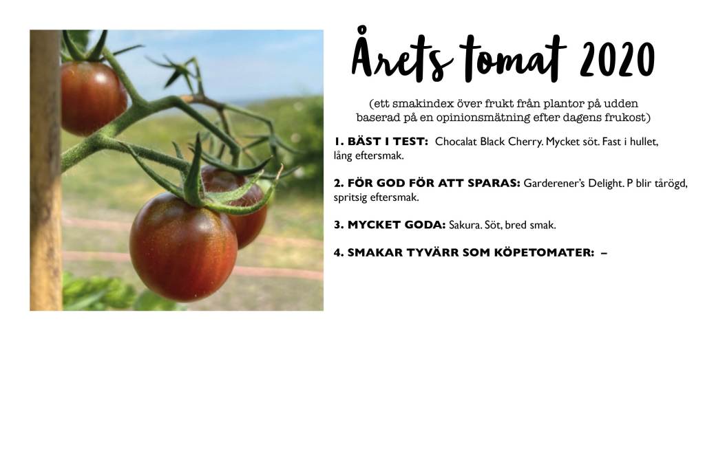Men framför allt gjorde regnet att tog vi oss äntligen tid att genomföra vårt första tomattest. Det behöver ingen närmare förklaring. För en man, som inte för så länge sen trodde att en tomat är en tomat, innebär hennes 17-18 sorter där ute gärna skapa ordning, lista och ranka.