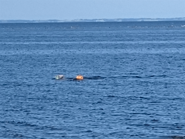 Han: Tack min fru. Men det händer inte bara små underverk på land. Har man har fönsterbord på sjösidan händer det också saker. Flasknosdelfinen har setts utanför Västervik. Men hur många har sett en gulbojad vit medelåldersman simma förbi utanför sin udde? Det gör vi just nu.