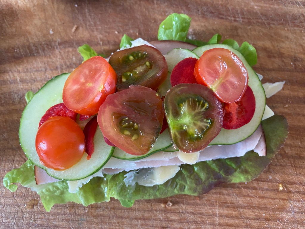 Hon: regnar, 14,5 gr men ganska lite vind. Blir ändå förstås frukost i sängen. Hämtar in gurka, en drygt 30 cm lång lite taggig men god Tanja. Två sorters tomater, Black Cherry och Chielega. Tre sorters chili, Gul Körsbärschili (fast nu mogen och röd), Aji Cristal och Black Checkoslovakien (eller hur det stavas…). Och så lite plocksallad. Och så bröd bakat igår, en snabb nöt- och frölimpa. Bäst hittills tyckte Peppe, hur man nu ska tolka det…