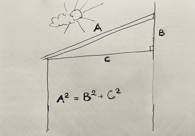 Nu ska jag gå ut och såga till de fem takstolarna i 45 x 120 mm reglar, där Överliggaren (hypotenusan, A) förhåller sig till takstolens två andra sidor (kateterna B och C) enligt formeln: