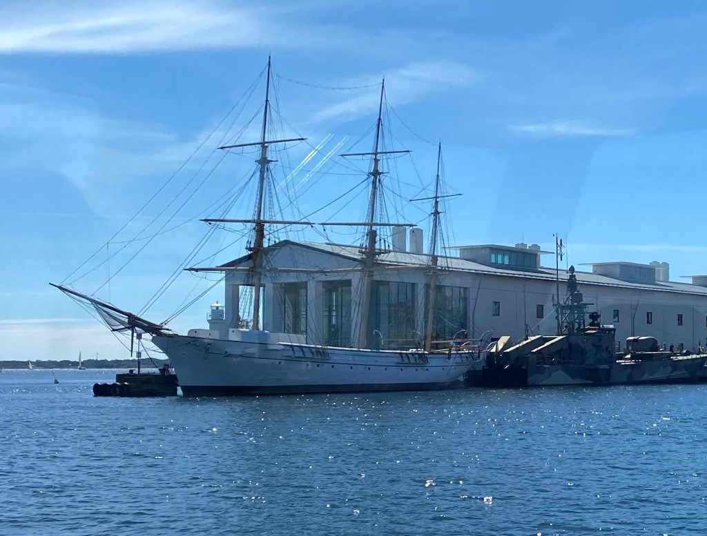 Men först fick vi åka sjöbussen ut från Karlskrona hamn, och det första vi passerade var Sveriges minsta fullriggare Jarramas. Det var min pappas skolfartyg som Skeppsgosse i flottan. 1932 seglade han över Atlanten på af Chapman som är Jarramas ”storebror” och huserar i Stockholm som vandrarhem nu för tiden. Det var 300 Skeppsgossar ombord på den resan. Känns trångt även om Chapman är mycket större…