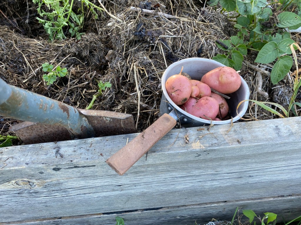 Han: Och dagen till ära firar vi alla systrar med årets första hemodlade potatis. En kastrull Monte Carlo direkt ur tång från Kalmarsund.
