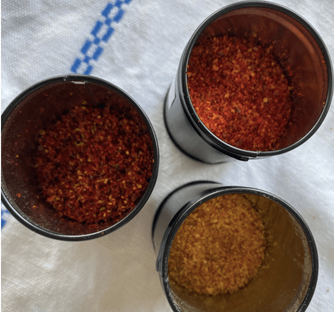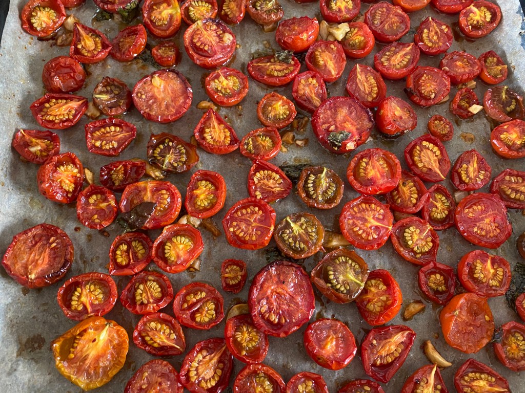 Hon: här föll jag för en trend jag snappat upp, testat en plåt med ugnsrostade tomater. Annars kör jag ”soltorkade”. I ugn då, men med bara salt och låg temperatur länge, tills de helt torra. Då håller de i flera år. Om jag inte ska lägga in dem vill säga, då tar jag dem lite tidigare.