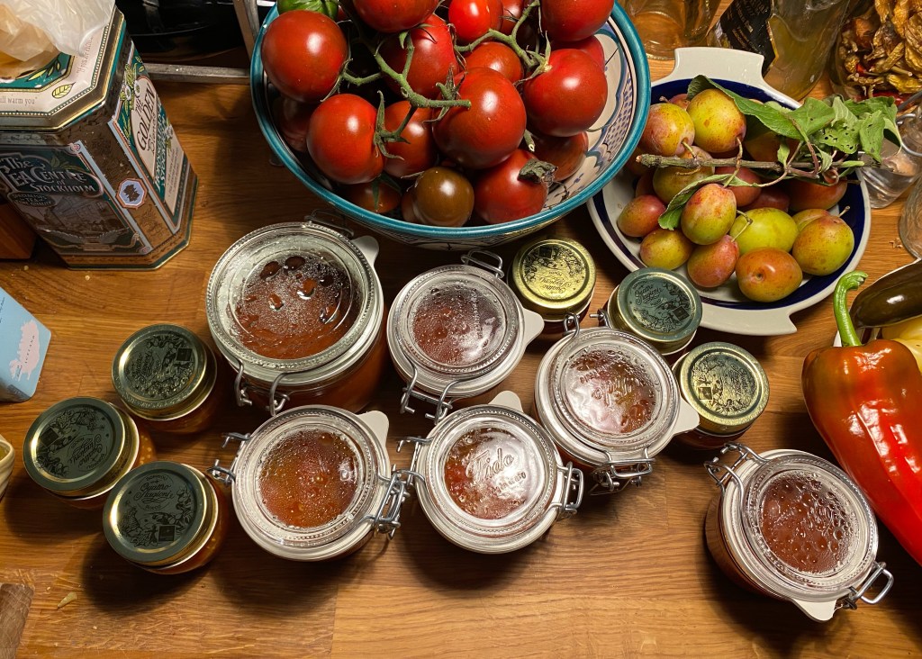 Hon: och mitt dagsverke, 12 burkar, ketchup o marmelad med tomater som bas.
