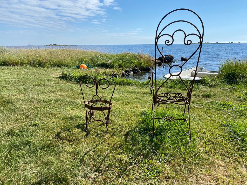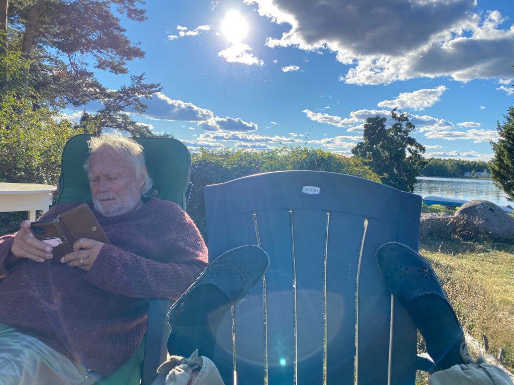 Han:Utanför altanen mot sjön står de båda stolarna som en installation. Varje morgon när vi äter frukost här ute påminner stolarna mig om hur jäkla skönt det är att inte vara chef.