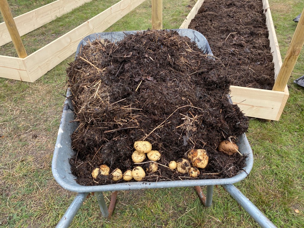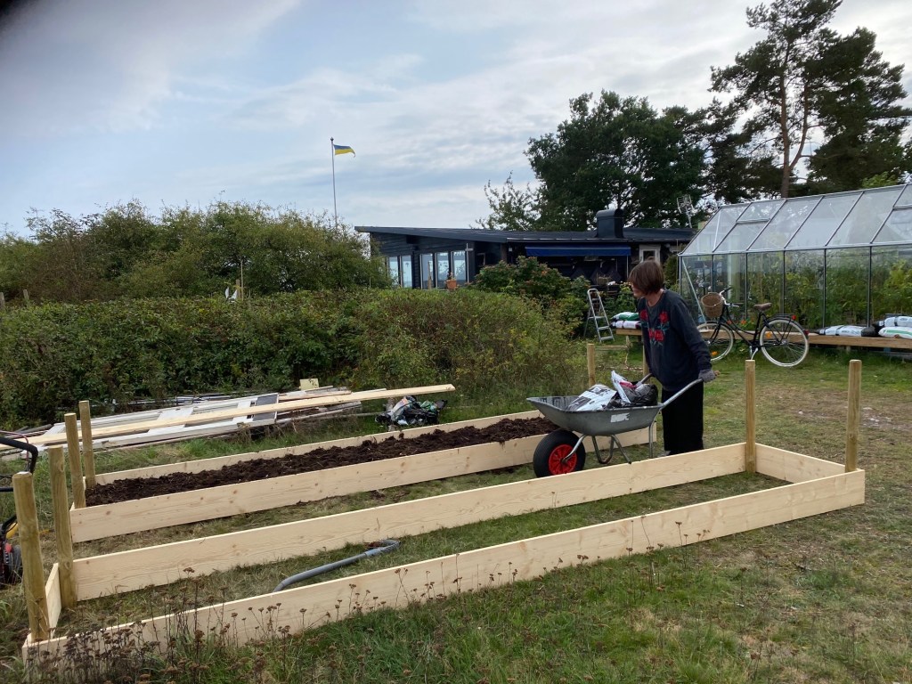 Det är också lite algomin iblandat, liksom kaffesump och pytte pytte hönsgödsel. Ska på med mer täckmaterial imorgon på den o-planterade delen så inte kissarna tror det är deras nya toa … sedan blir det vitlök där, men det får vänta ett par veckor till.