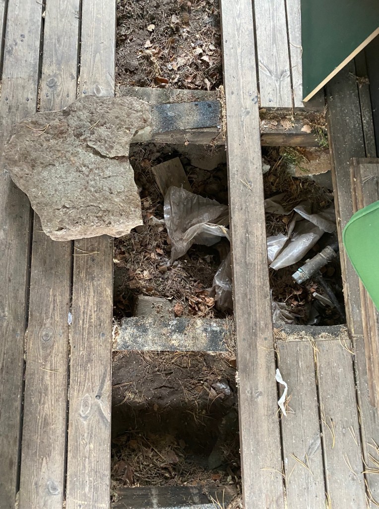 För egen del har jag satt upp en hängränna på nya växthuset (halvfärdigt). Dessutom har jag genomfört en fredlig luta-dig-mot-spaden-demonstration. Nåt luktar illa under däcket till Margaretas Chateau.
