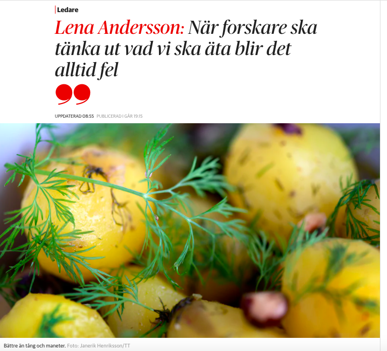 Precis den känslan får jag ofta när jag läser Lena Anderssons krönikor i Dagens Nyheter. Hon formulerar alltid frågorna på sätt som gör att de gamla kända svaren pekar fel. Så även idag: ”Kanske borde vi i all enkelhet bara äta mer potatis i stället för alla dessa tillkrånglade artificiella, påhittade, sammanhangslösa uttänktheter grundade i en mekanistisk syn på människan.”