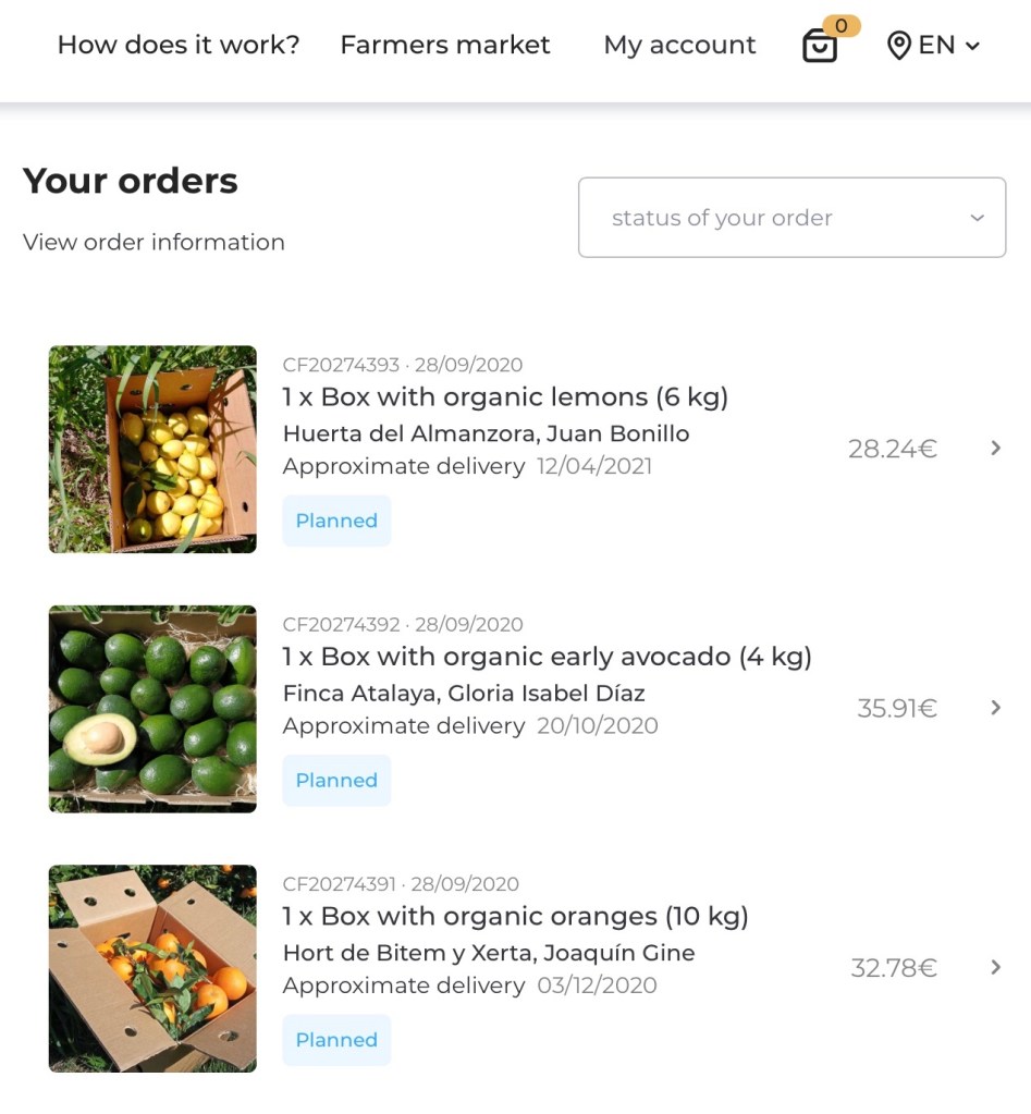 Hon: om ni orkat er ända hit ner så började min morgon med beställning av 10 kg apelsiner från Spanien av Joaquin Gine, 6 kg citroner av Juan Bonillo och 4 kg avokado av Gloria Isabel Diaz. Genom organisationen Crowd Farming.