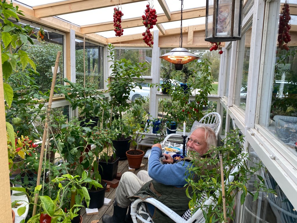 Kvällens drink i ”nya” växthuset med uppsikt över citronträdet. Han har satt dit en värmelampa, jätteskönt!