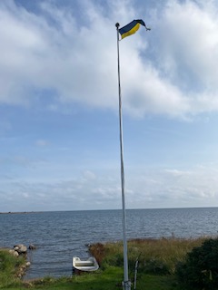 Min kära svärmor tog alltid ner vimpeln när det blåste, men på udden blåser det ju alltid. Dessutom är vimpeln mitt standar. Läser på Wikipedia att en vimpel är ”en avlång tillspetsad och i vissa fall kluven flaggduk som antingen kan ersätta en nationsflagga då flaggning inte sker eller som kan agera symbol i sig självt”. För mig är vimpeln en symbol som visar att udden är bebodd och halas därför bara när jag inte är här.