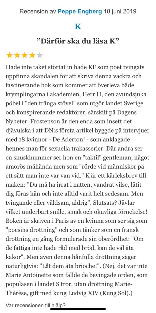 Boken vi ska diskutera är K av Katarina Frostensson. Kul, fast jag borde skummat igenom den en gång till. Läste den precis när den kom ut och det är ju ett drygt år sedan nu. Men jag har ändå fortfarande en klar bild av den. För säkerhets skull skickade han sin recension på Bokus till mig lite så där som en hint… tror nog jag klarar av tyckandet själv, ha ha.