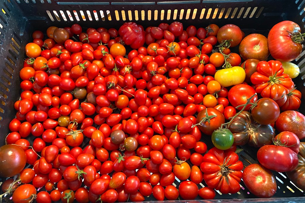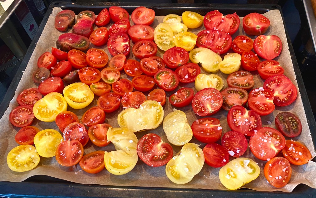 Hon: kroppen behöver vila, även hans, så jag bestämde direkt vid frukost att idag vilar vi inne. Regnet hjälpte beslutet på vägen… men man måste ju inte göra ingenting för det, och jag har massa saker att göra inne. Städa t ex, men inte en kroppsvilodag. Börjar med tomaterna, fyller en plåt för ”soltorkning”.