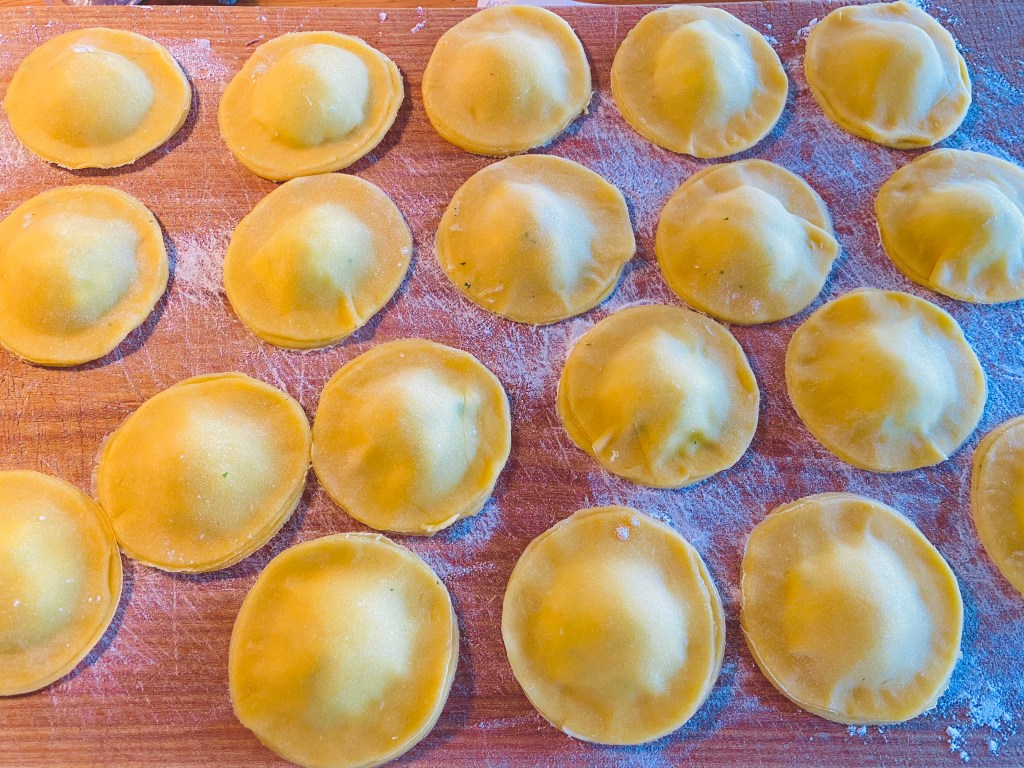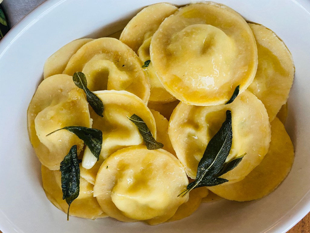 Raviolin med salvia- och citronsmör var däremot inte den bästa jag gjort. Raviolin var ganska bra faktiskt, trots att Tempo inte hade någon ricotta, så blev svensk färskost istället. Men smörskyn smakade för lite salvia, hade ändå i mycket från tre olika salviaplantor som vi har ute. Kanske har det regnat för mycket senaste dagarna. Tomater och chili blir ju lite vattniga i smaken om de nyss fått mycket vatten… men ändå en helt ok tisdagsmiddag. Nu ska vi snart kolla Kockarnas kamp!