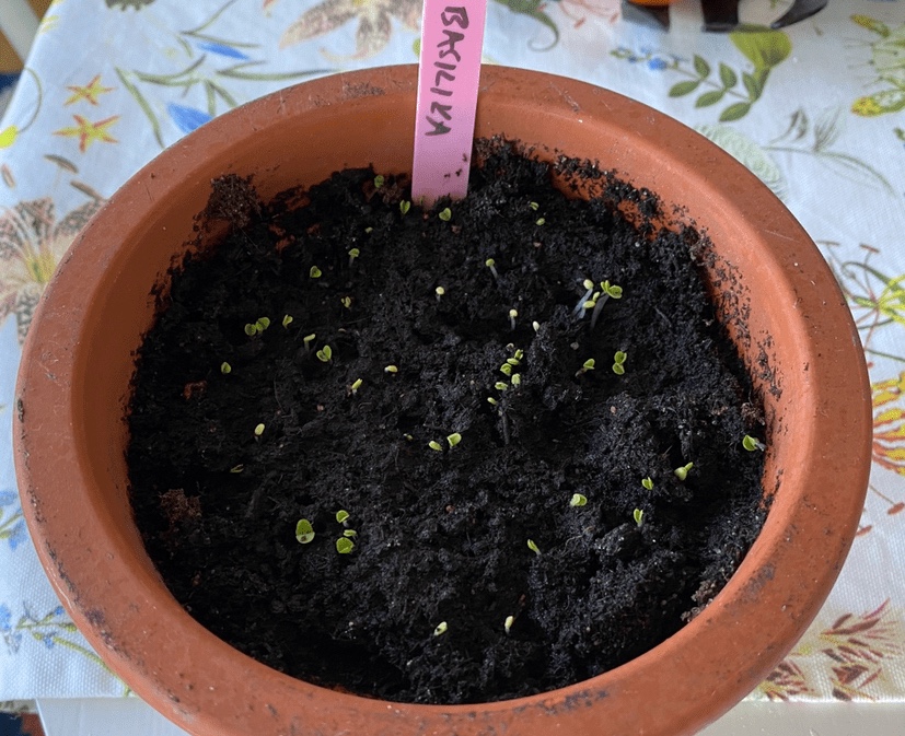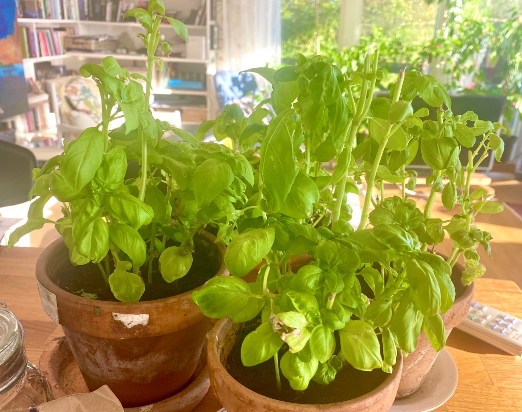 Och så måste jag visa mina fyra små krukor med basilika som fortfarande leverera nya fina blad. Ok, de ser kanske inte jättemycket ut för världen längre, jag tar ganska mycket av dem nästan var dag, men med tanke på att jag bara satte frön i en liten kruka och det redan i månadsskiftet mars/april, så är det väl helt otroligt bra. Tycker jag 🙂