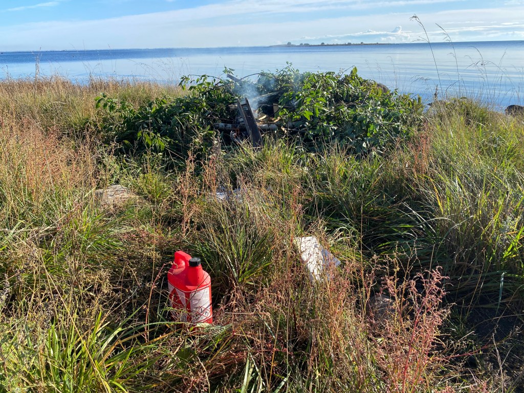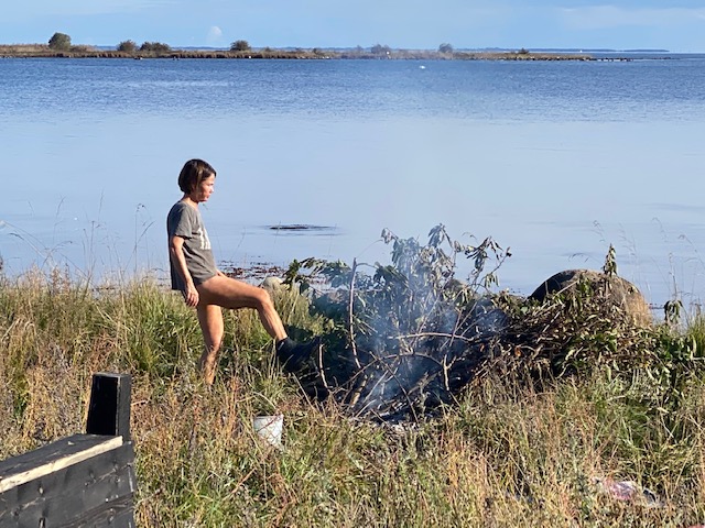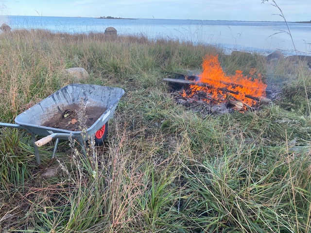 Men framför blev elden någonting att samlas kring och det är vad vi gjort idag. Vi har eldat upp grenar och den gamla trallen hos Margareta. Självklart gned jag jag två pinnar mot varann och det tog ett tag innan tändvätskan började brinna.