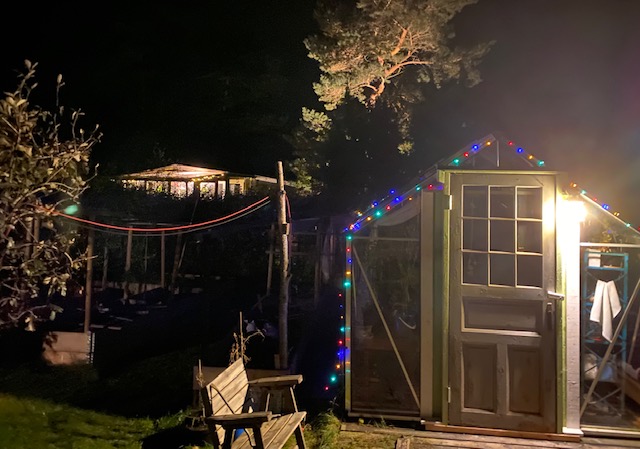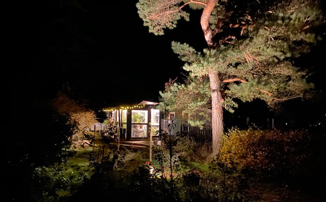 Han: Och när mörkret sänker sig igen över udden ser vi resultatet av El-Görans arbete. Vackert, även om hon undrar varför ljusslingan kring Växthus 1 plötsligt är flerfärgad och blinkar som det gjorde på det kringresande tivoli som besökte Torsås när hon var barn.