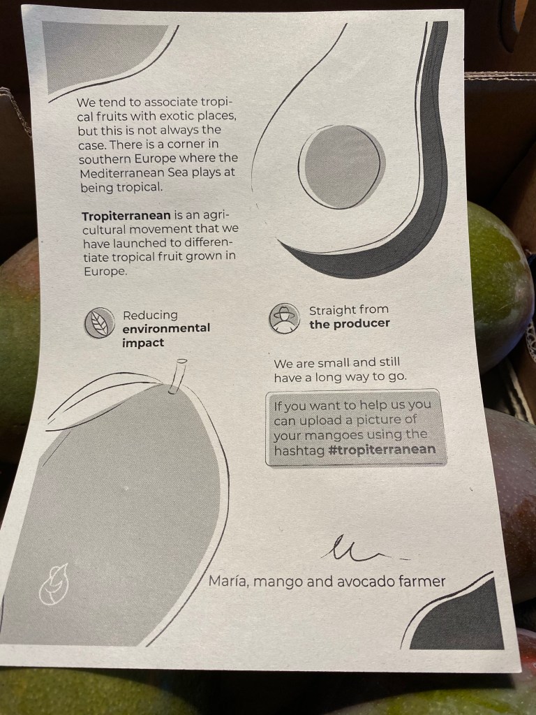 Och helt plötsligt kom mina mangos från Maria på Finca Los Pepones i Malaga, så kul! Och på torsdag kommer avokados från en annan odlare i Spanien. Allt direkt från odlaren genom Crowd Farming som är en organisation som stödjer småskaliga ekologiska odlare. Och vilka gigantiska mangos sen, aldrig sett så stora och fina förut.