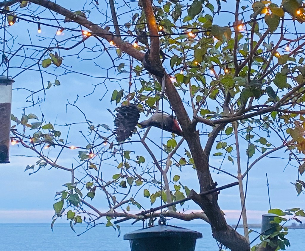 – Och se där, en större hackspett tränger sig fram till buffén.