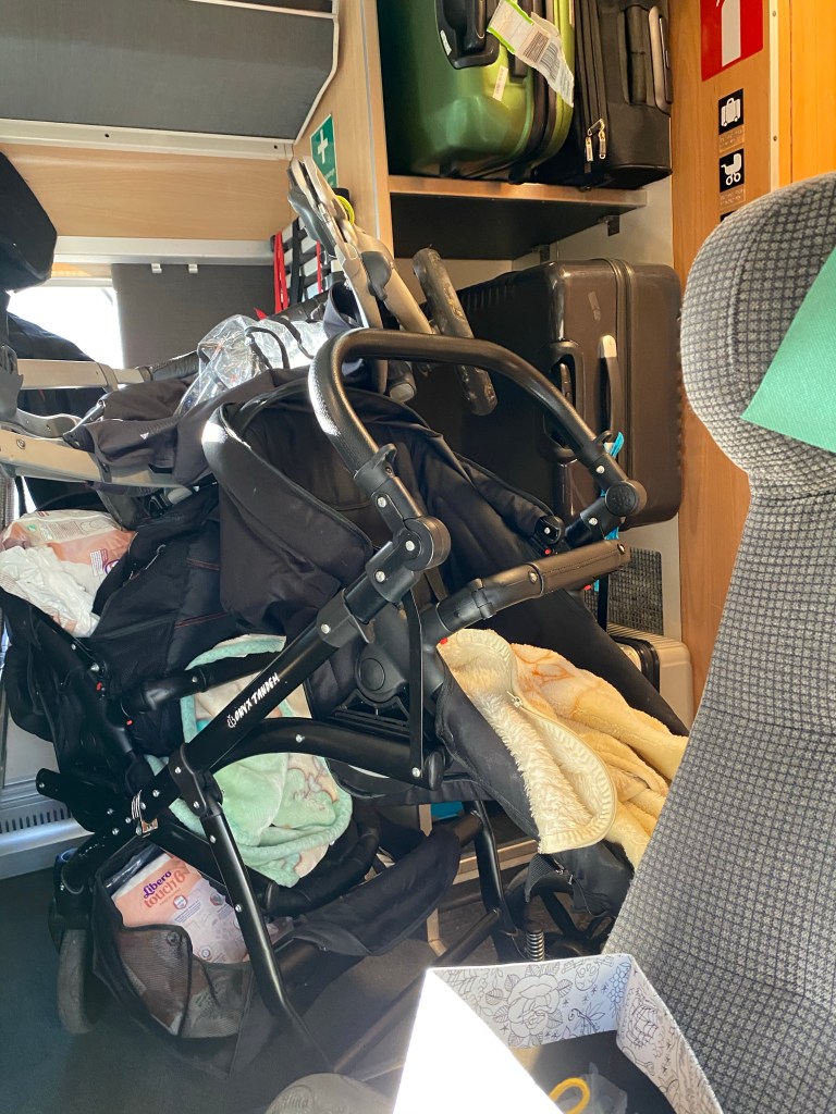 Hon: jo det har det, förutom knökfullt tåg med barnvagnar i hela gången vid våra platser, messar sonen och säger att det är terrorhot i Stockholm och det kryllar med poliser utanför centralen… ur askan i elden alltså!