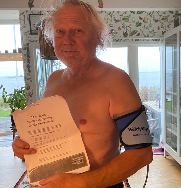 Och nu går jag alltså omkring med en blodtrycksmätare som fyra gånger per timme påminner mig om att jag lever. Återbesök klockan 13:45 i morgon.