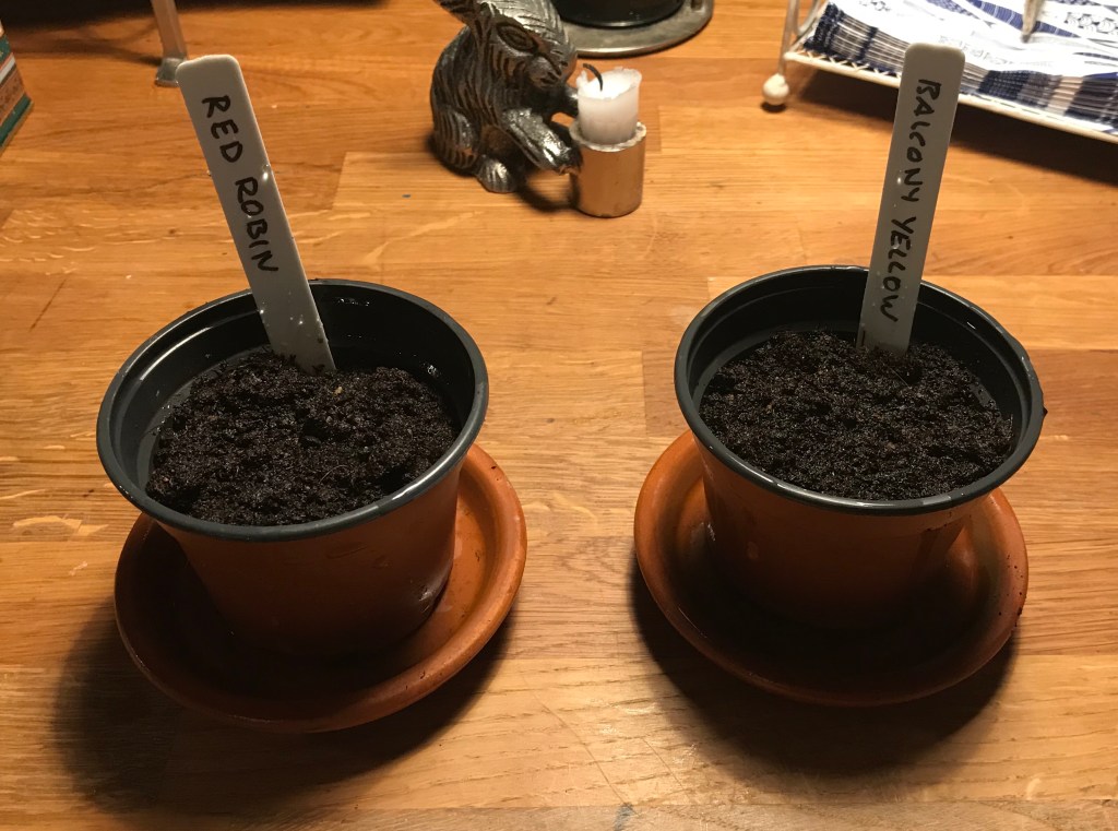Två små kruktomatsorter, fyra frön i vardera krukan