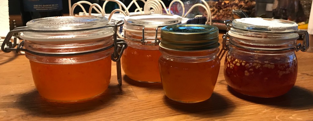 En del av mina långsammaste chilisorter ska jag också börja sätta i dagarna. Men först måste jag ta hand om de sista kvarvarande på plantorna från i år. En liten burk med en supergod sambal oelek med limejuice, och tre burkar med ren chilimarmelad fick jag gjort idag. Nu tror jag det blir soffan och en bok faktiskt. Han sover middag…