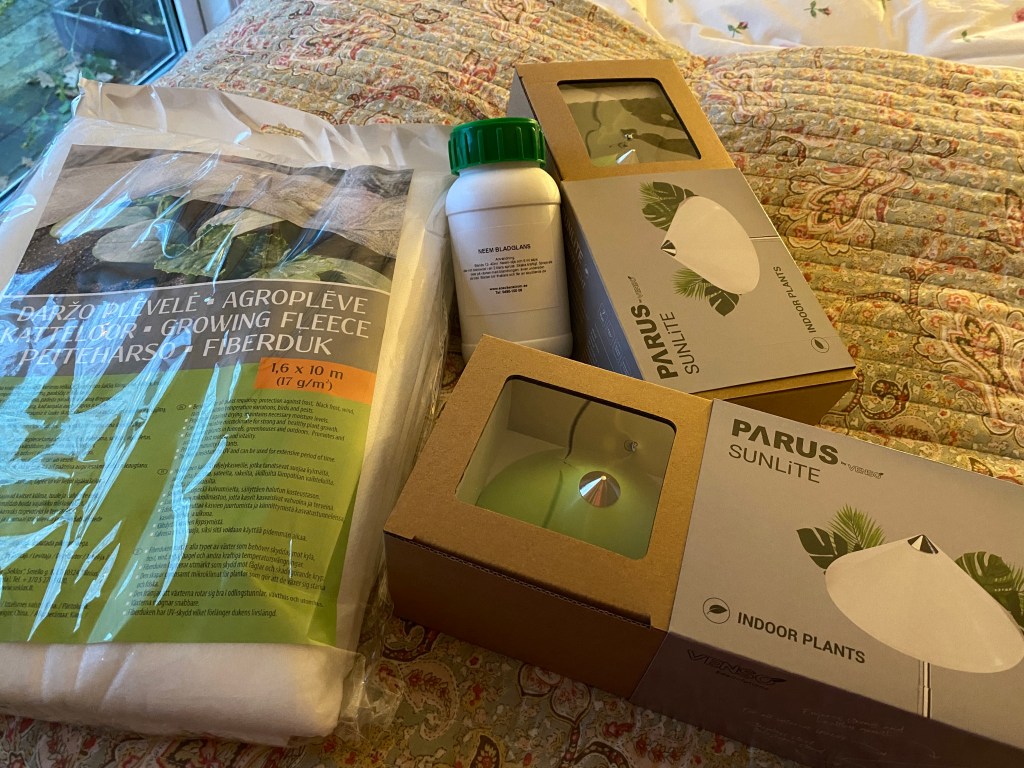 Hon: förutom hämtat julpynt och städat upp i lagret hämtade vi också upp diverse postorderleverenser uppe i byn. Den bästa kom från Sneckenströms. Neemolja för att ta kål på bladlössen, fiberduk för att skydda mot frost och så bäst av allt; små lampor med dagsljus för mina små nyplanterade tomater. Så himla fiffig lösning. Man sticker liksom ner lampan i jorden, sedan kan man dra upp den allt eftersom plantan växer, typ som en gammal radioantenn.