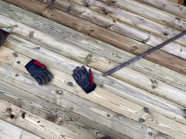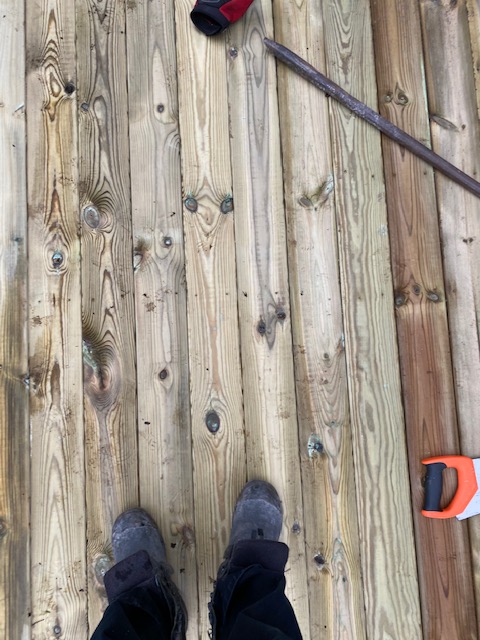 Skojar, jag gick över till Margaretas för att lägga lite trall på nya verandan. Det går långsamt, men jag har inte bråttom. Resan är allt, målet intet.