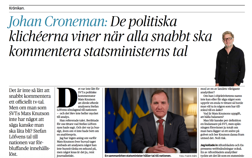 Nästan like illa: Inte heller minns jag en enda mening som SVT:s kommentator Mats Knutson sa direkt efter talet. Det är först när jag läser dagens Croneman som jag inser att Hon ännu inte behöver skaffa mig ett enkelrum på Mariahemmets äldreboende i Torsås: ”Stefan Löfven hade hållit ett ”förmaningstal”, menade Mats Knutson. Det var ”en sammanbiten statsminister” och han hade ”ett bistert budskap”. En av Aftonbladets analytiker tyckte att det lät som en statsminister i krig, i Expressen tyckte man att statsministerns budskap var en ”uppläxning”.