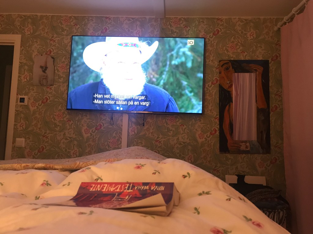 Hon: jättetrött, idag har jag städat som en tok. Men fortfarande inte fått upp något pynt i hus 1, fast plockade lite mossa i alla fall. Tog en kort skogspromenad i skymningen efter att ha varit inne hela dagen när solen sken… blir en tidig kväll. Tänkte läsa i sängen, men han zappar mellan det ena tokigare programmet än det andra. The Crown ville han däremot inte se, ”vi kan väl läsa lite istället…”